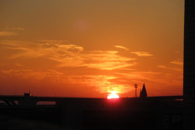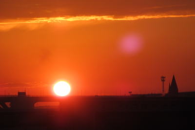 | 帰ってきたらまた先日と同じように超きれいな夕日に思わずパチリ 1週間ほどで日の入りの場所がかなり南の方にずれてる。 |